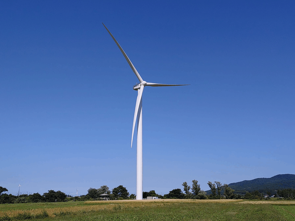 風力発電の巨大な風車が並び、まるで絵ハガキのような景色。
