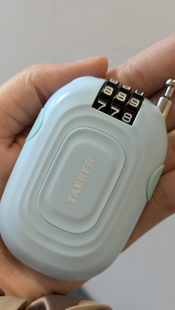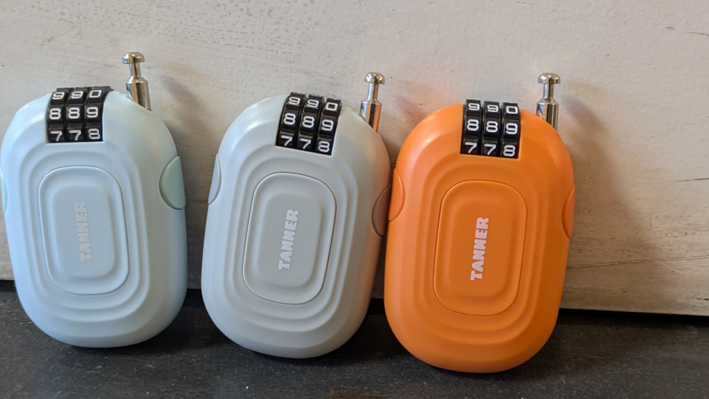 特に水色のものが、ボタンの色がエメラルドっぽい色になっていてとてもかわいいと思っています!ちなみにとても個人的ですが、真ん中に白で書かれた「TANNER」の文字もちょっとつぶれた感じのフォントがかわいいです。少しの間だけ停めておくのに鍵をかけるのが面倒くさく思ってしまいがちですが、見た目が可愛いこのワイヤーロックなら逆に楽しみになりそうです。(笑)